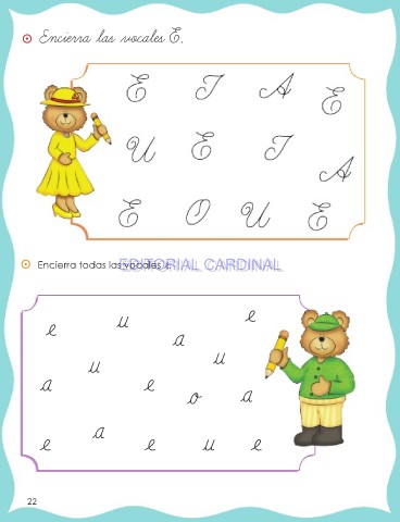 ⵙ Encierra las vocales E. ⵙ Encierra todas las vocales e. EDITORIAL CARDINAL EDITORIAL CARDINAL e u a e u u a e o a e a e u e 22 22