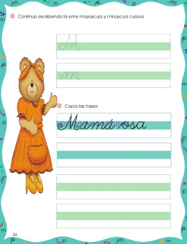 m p m ⵙ Continúa escribiendo la eme mayúscula y minúscula cursiva. m ⵙ Copia las frases: Mamá p EDITORIAL CARDINAL EDITORIAL CARDINAL p m 26 p m