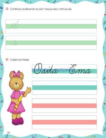 s l ⵙ Continúa escribiendo la ese mayúscula y minúscula. s s ⵙ Copia las frases: Osita Ema l EDITORIAL CARDINAL EDITORIAL CARDINAL l s 28 l s