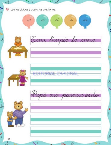 s l ⵙ Lee los globos y copia las oraciones. s sa se si so su Ema limpia la mesa s l EDITORIAL CARDINAL EDITORIAL CARDINAL Papá oso pasea a osito l s 32 l s