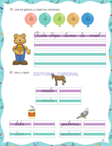 s l ⵙ Lee los globos y copia las oraciones. s la le li lo lu Osito Pepe lame la miel s l ⵙ Lee y copia. EDITORIAL CARDINAL EDITORIAL CARDINAL mula mula l lata paloma lata paloma s 33 l s