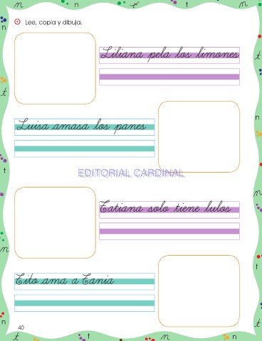 n t ⵙ Lee, copia y dibuja. n Liliana pela los limones n Luisa amasa los panes t EDITORIAL CARDINAL EDITORIAL CARDINAL Tatiana solo tiene lulos t Tito ama a Tania n 40 t n
