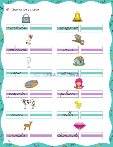 v v ⵙ Observa, lee y escribe. v candado campana pelícano mico v v copa EDITORIAL CARDINAL casa EDITORIAL CARDINAL pescado peluca vaca pollo v venado diamante v 54 v v