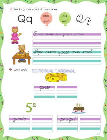 q q ⵙ Lee los globos y copia las oraciones. q Qq que qui qui que Ema come un queso suave q Pepe come queso con miel q ⵙ Lee y copia. EDITORIAL CARDINAL EDITORIAL CARDINAL queso q quinto ponqué q 57 q q