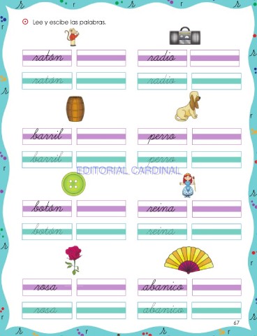 r r ⵙ Lee y escibe las palabras. r ratón radio ratón radio r barril perro barril perro r EDITORIAL CARDINAL EDITORIAL CARDINAL botón reina botón reina r rosa abanico rosa abanico r 67 r r
