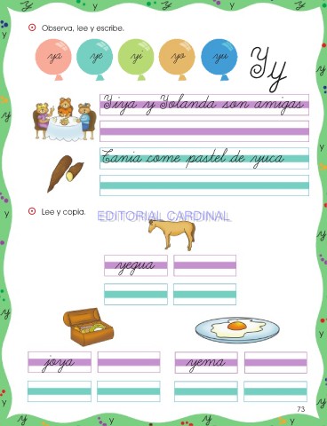 y y ⵙ Observa, lee y escribe. y Yy ya ye yi yo yu Yiya y Yolanda son amigas y Tania come pastel de yuca y ⵙ Lee y copia. EDITORIAL CARDINAL EDITORIAL CARDINAL yegua y joya yema y 73 y y