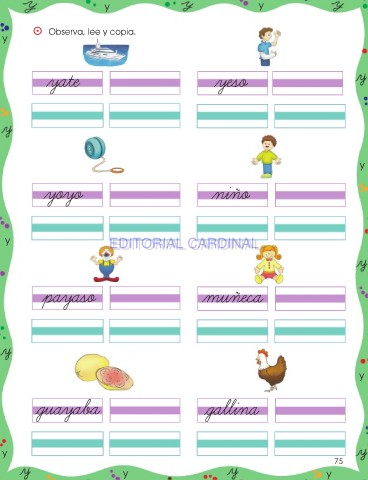 y y ⵙ Observa, lee y copia. y yate yeso y yoyo niño y EDITORIAL CARDINAL EDITORIAL CARDINAL payaso muñeca y guayaba gallina y 75 y y