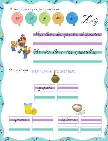 z z ⵙ Lee los globos y escribe las oraciones. z za ze zi zo zu Pepe lleva los zapatos al zapatero z Zorrito lleva las zapatillas z ⵙ Lee y copia. EDITORIAL CARDINAL EDITORIAL CARDINAL zapote z zumo azúcar z 79 z z