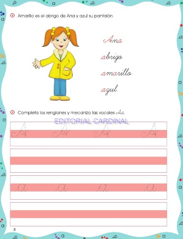 a ⵙ Amarillo es el abrigo de Ana y azul su pantalón. a na abrigo amarillo a azul ⵙ Completa los renglones y mecanizo las vocales Aa. a EDITORIAL CARDINAL EDITORIAL CARDINAL a a 8 8 a a
