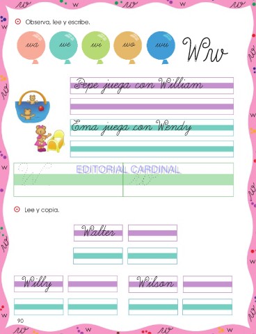 w w ⵙ Observa, lee y escribe. w Ww wa we wi wo wu Pepe juega con William w Ema juega con Wendy w EDITORIAL CARDINAL EDITORIAL CARDINAL ⵙ Lee y copia. Walter w Willy Wilson w 90 w w