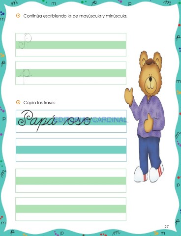 m p m ⵙ Continúa escribiendo la pe mayúscula y minúscula. m ⵙ Copia las frases: Papá p EDITORIAL CARDINAL EDITORIAL CARDINAL p m 27 p m