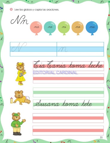 n t ⵙ Lee los globos y copia las oraciones. n na ne ni no nu n Tia Tania toma leche t EDITORIAL CARDINAL EDITORIAL CARDINAL usana toma tete t n 35 t n