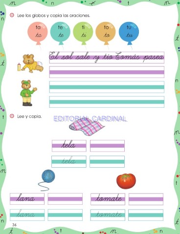 n t ⵙ Lee los globos y copia las oraciones. n ta te ti to tu ta te ti to tu El sol sale y tío Tomás pasea n t ⵙ Lee y copia. EDITORIAL CARDINAL EDITORIAL CARDINAL tela tela t lana tomate lana tomate n 36 t n