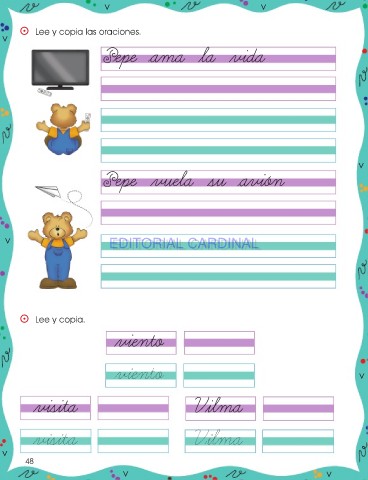 v v ⵙ Lee y copia las oraciones. v Pepe ama la vida v Pepe vuela su avión v EDITORIAL CARDINAL EDITORIAL CARDINAL ⵙ Lee y copia. viento viento v visita Vilma visita Vilma v 48 v v