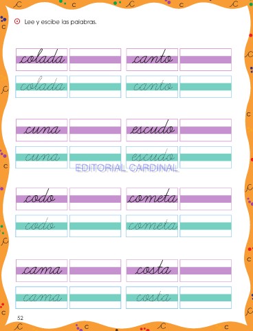 c c ⵙ Lee y escibe las palabras. c colada canto colada canto c cuna escudo cuna escudo c EDITORIAL CARDINAL EDITORIAL CARDINAL codo cometa codo cometa cama costa c cama costa c 52 c c