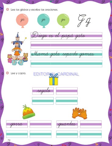 g g ⵙ Lee los globos y escribe las oraciones. g G g ga go gu Diego es el papá gato g Mamá gata reparte gomas g ⵙ Lee y copia. EDITORIAL CARDINAL EDITORIAL CARDINAL regalo g gorra guantes g 72 g g