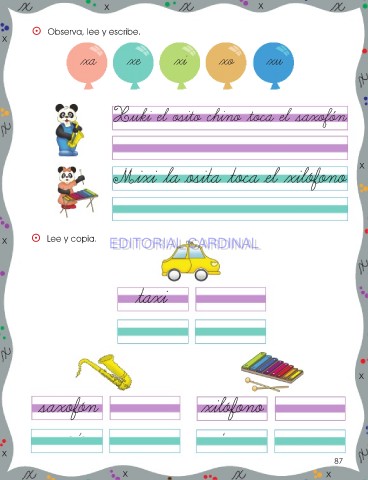 x x LETRA Xx ⵙ Observa, lee y escribe. x xa xe xi xo xu Xuki el osito chino toca el saxofon x Mixi la osita toca el xilófono x ⵙ Lee y copia. EDITORIAL CARDINAL EDITORIAL CARDINAL taxi x saxofón xilófono x 87 x x