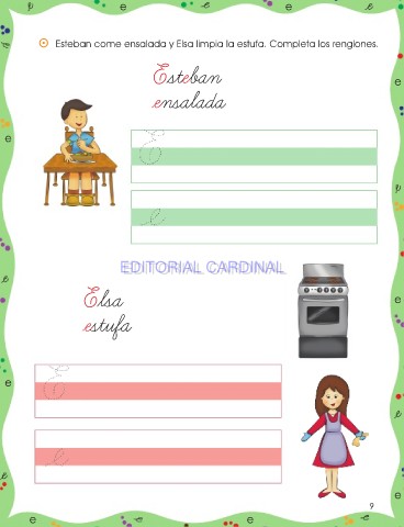 e e ⵙ Esteban come ensalada y Elsa limpia la estufa. Completa los renglones. Esteban e ensalada e EDITORIAL CARDINAL EDITORIAL CARDINAL Elsa e estufa e e 9 9 e e